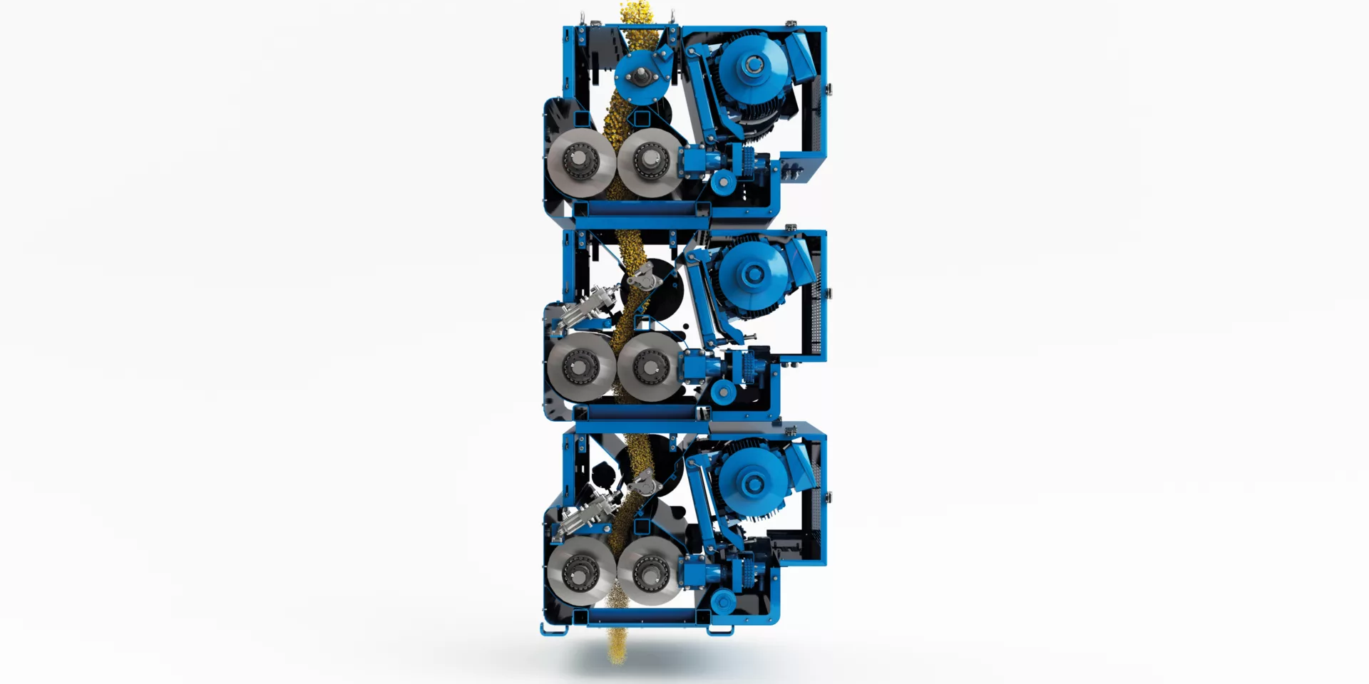 The Roller Mill is designed for breaking and structurising grains, oilseeds and biomass with high accuracy and low energy consumption. An integrated dual-rotation feeder ensures even product flow or bypass, while large-diameter rollers deliver consistent particle size with minimal fines. The modular design allows capacity expansion, improves access for cleaning and maintenance, and supports stable, efficient operation.